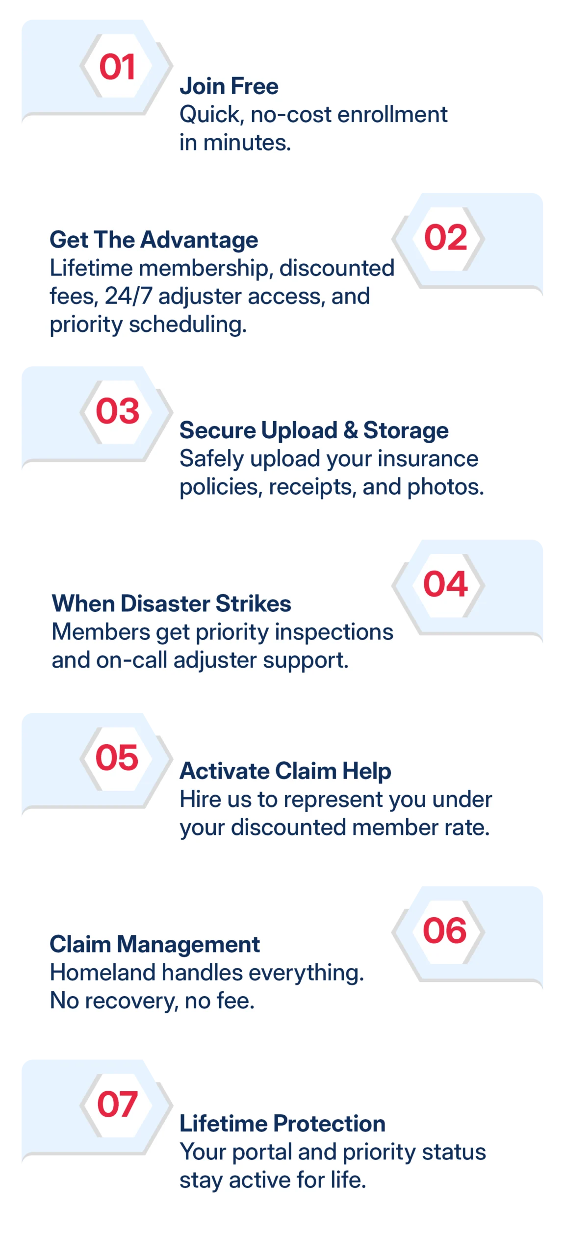 Membership in Adjuster Advantage™ does not itself create representation by Homeland Public Adjusters. Representation on any insurance claim requires a separate, written agreement with Homeland Public Adjusters, as required by state law. Membership benefits such as discounted rates, priority scheduling, and access to tools are provided for preparedness and support purposes only. Outcomes are not guaranteed, and recoveries vary based on individual circumstances and policy coverage.